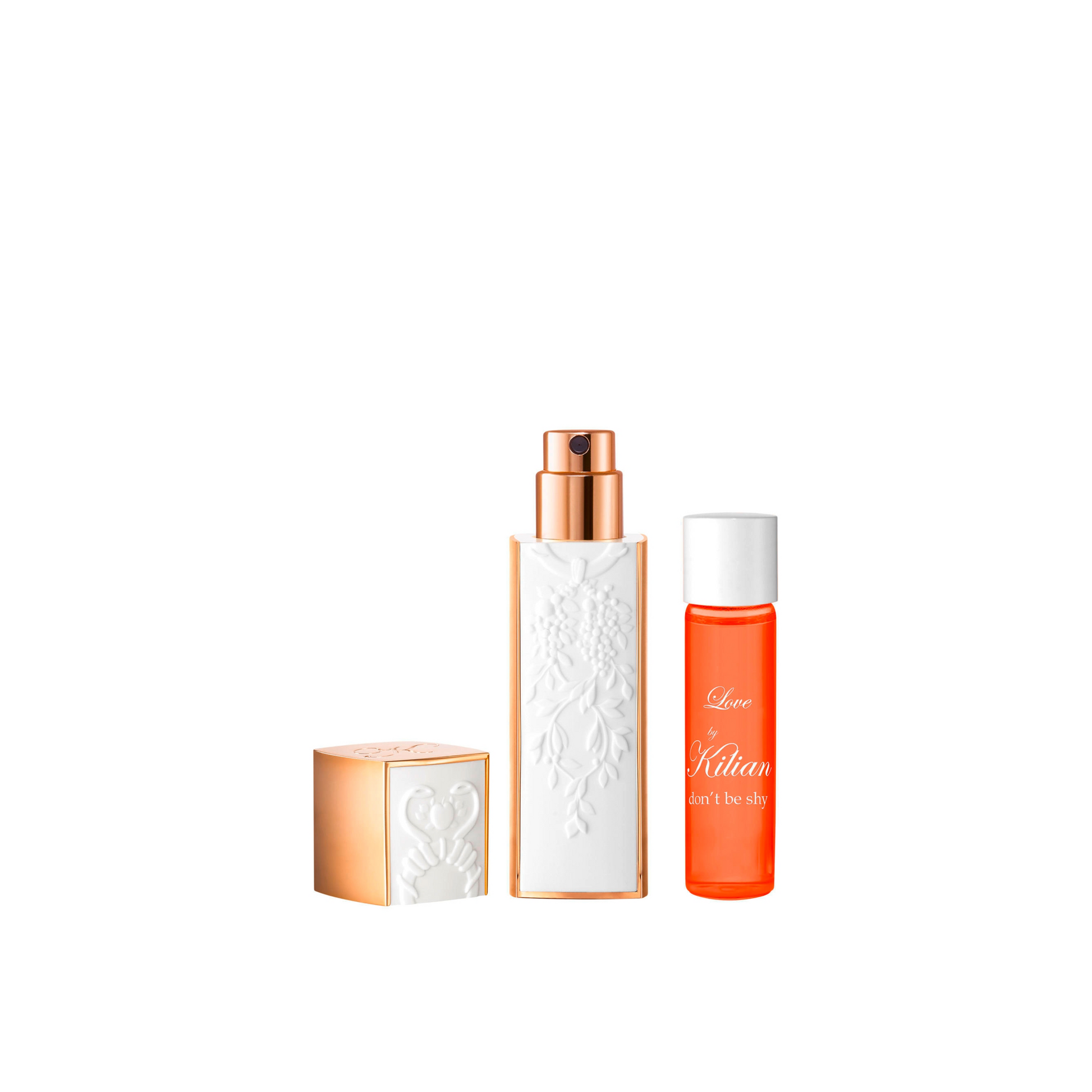 Une grande attention est placée dans chaque flacon de parfum rechargeable KILIAN PARIS, pour faire de ces derniers de véritables objets précieux. Les flacons de parfum de la famille des fleurs narcotiques sont ornés d'une laque blanche et minutieusement gravé de chaque côté, d'un motif entremêlant porte, serpent, vigne et pomme - les symboles du péché originel - allusion au destin.